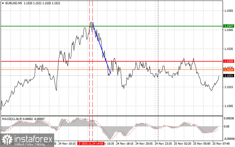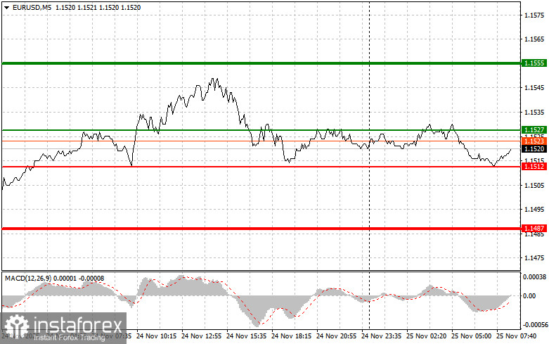 情境二:如果出現兩次連續測試1.1512的情形,且此時MACD指標處於超賣區域,我也計劃今天購買歐元。這將限制歐元對的下跌潛力並導致市場向上逆轉。增長可望指向 1.1527 和 1.1555 這些相對應的水平。