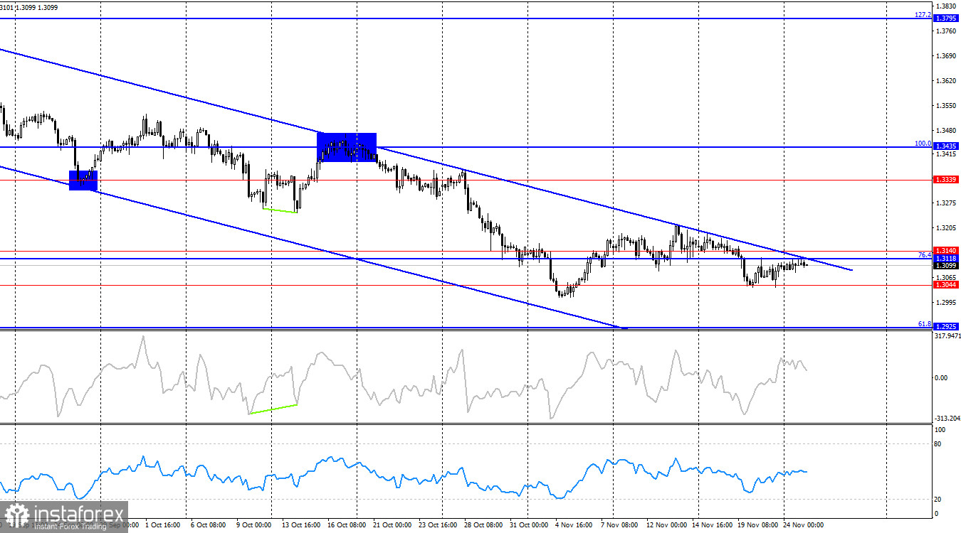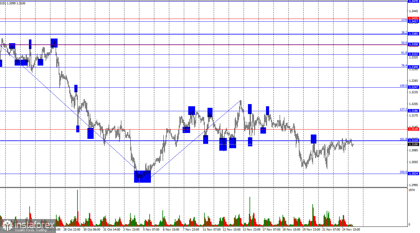 週一並無任何資訊背景,這一點從該貨幣對的日內走勢中可以清楚地看出。最近交易者的活躍度較低,而在毫無新聞時則進一步降低。今天,美國將發佈幾份重要報告,它們的數據將決定市場情緒。ADP 私營部門就業變動報告現在每週發佈,零售銷售反映了美國消費者對經濟前景的信心,生產者物價指數間接影響著通脹數據,這對於聯邦公開市場委員會(FOMC)而言尤其重要,特別是在十二月會議之前。因此,在某些情況下,今天可能會出現相當活躍的走勢,但預計此類積極的動作應該僅在下半天才會出現。英鎊仍然徘徊在 1.3110–1.3139 水平,並已連續數週在此附近徘徊。