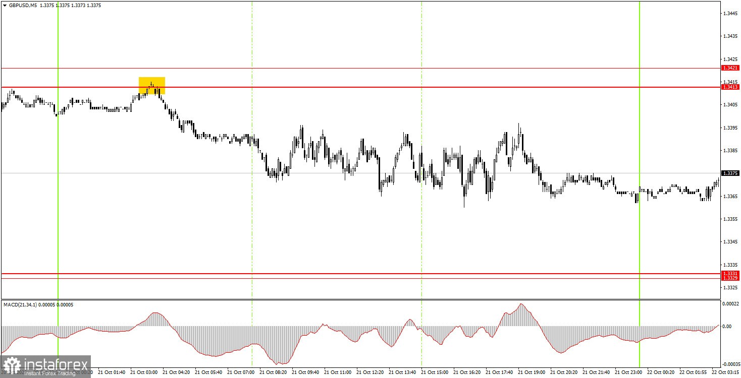 Auf dem 5-Minuten-Chart kann man jetzt bei den Levels 1.3102-1.3107, 1.3203-1.3211, 1.3259, 1.3329-1.3331, 1.3413-1.3421, 1.3466-1.3475, 1.3529-1.3543, 1.3574-1.3590, 1.3643-1.3652, 1.3682 und 1.3763 handeln. Am Mittwoch wird das Vereinigte Königreich seinen Verbraucherpreisindex für September veröffentlichen - einer der ersten bedeutenden Wirtschaftsberichte der Woche. Dieser Bericht könnte auf den Märkten zu starken Reaktionen führen. Die Inflation im Vereinigten Königreich steigt seit einem Jahr stetig, und die Bank of England wird vermutlich vorerst die Zinsen nicht senken. Dies bleibt ein grundsätzlich positiver Faktor für das Pfund.