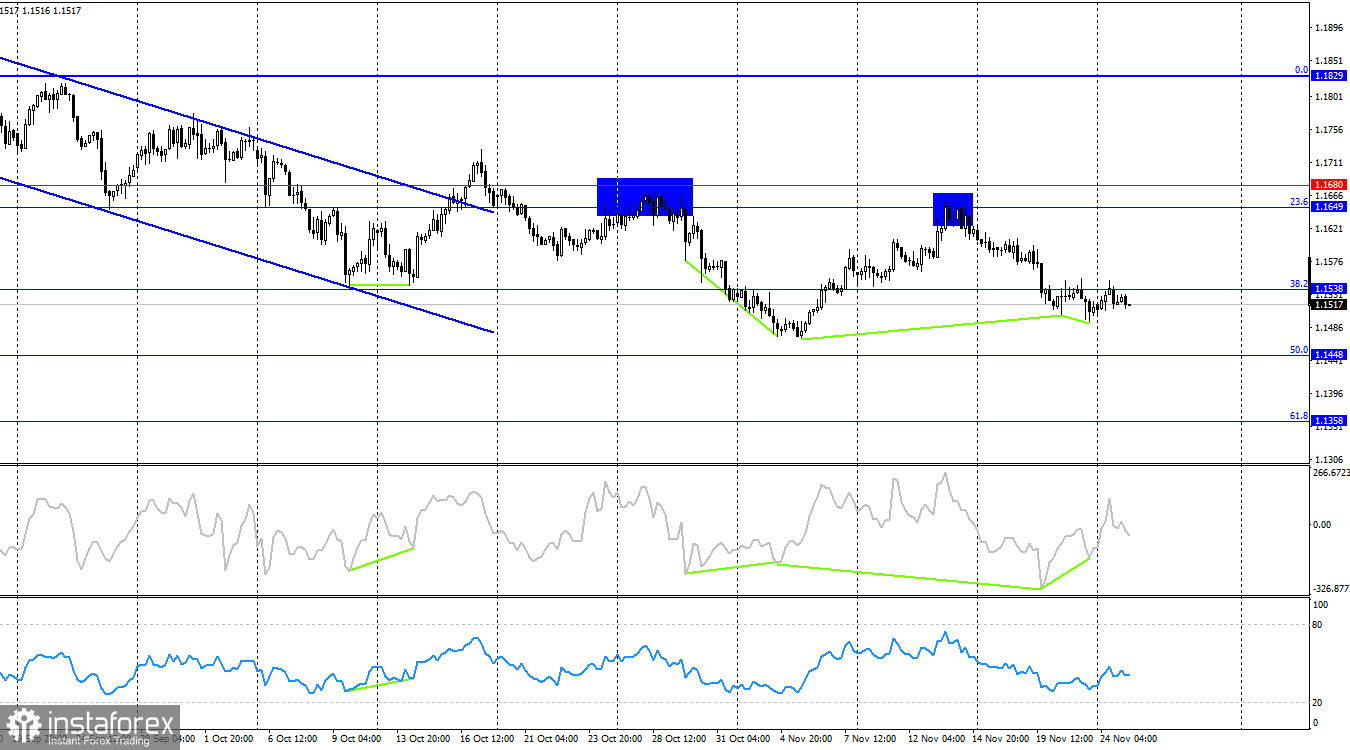 Die Wellensituation im Stundenchart bleibt einfach und klar. Die letzte Aufwärtswelle hat das Hoch der vorherigen Welle nicht überschritten, während die letzte abgeschlossene Abwärtswelle das vorherige Tief durchbrochen hat. Somit bleibt der Trend derzeit "bärisch". Bullische Händler sind in die Offensive gegangen, aber ihre Bemühungen reichen noch nicht aus, um einen Trend zu bilden. Damit der "bärische" Trend als beendet gilt, muss das Paar über das Niveau von 1.1656 steigen.