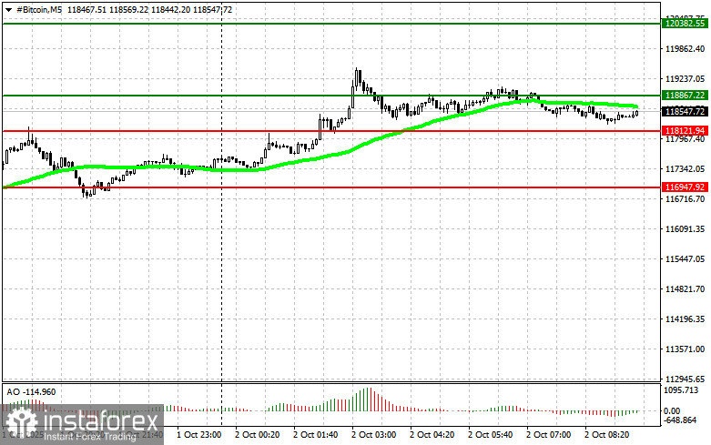 Scénario 1 : Je vais vendre du Bitcoin aujourd'hui au point d'entrée de 118 100 $, avec un objectif de baisse à 116 900 $. Je prévois de sortir des positions courtes autour de 116 900 $ et d'acheter immédiatement lors du rebond. Avant d'entrer sur une cassure, assurez-vous que la moyenne mobile sur 50 jours est au-dessus du prix actuel, et que l'Awesome Oscillator est en dessous de zéro.