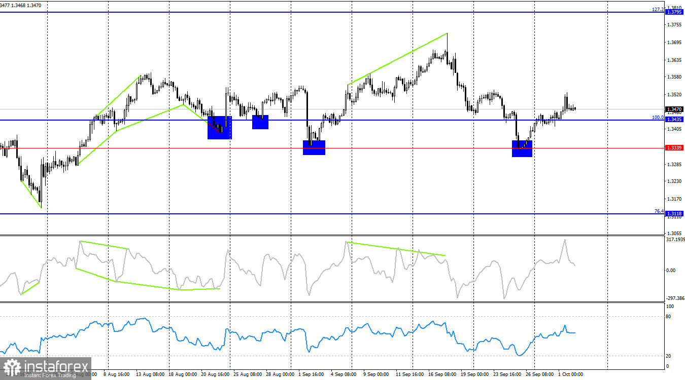 Mercredi, il n'y avait pas de contexte d'information pour la livre, tandis que le dollar américain a fait face à des signaux très contradictoires. Le rapport sur l'emploi d'ADP a montré une baisse de 32 000 emplois contre les attentes des traders de +40–50 mille. Cela signifie qu'il n'y a toujours aucun signe de reprise sur le marché de l'emploi après l'assouplissement monétaire de la Fed le 17 septembre. Certes, trop peu de temps s'est écoulé depuis la dernière réunion du FOMC, mais le fait demeure que le marché du travail américain est en mauvais état. Le rapport ISM sur l'indice manufacturier était légèrement meilleur. En réalité, il était tout aussi faible que celui de l'ADP: le chiffre de septembre était de 49,1 points. Toute lecture en dessous de 50 ne peut pas être considérée comme positive. Néanmoins, comparé à août, l'indicateur a augmenté de 0,4 point et a dépassé les attentes du marché de 0,1 point. Les "bears" ont profité de cela, mais ils manquent encore d'une plateforme informationnelle complète pour une attaque forte.