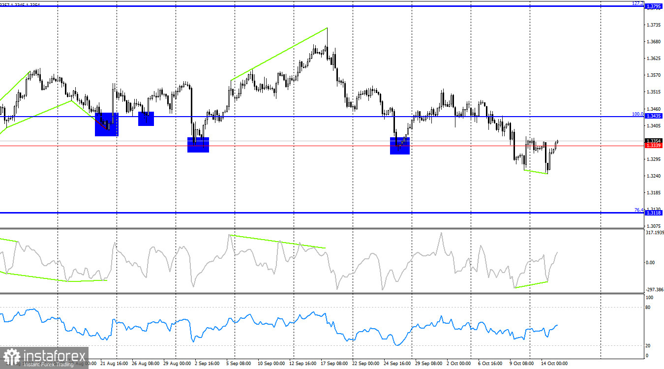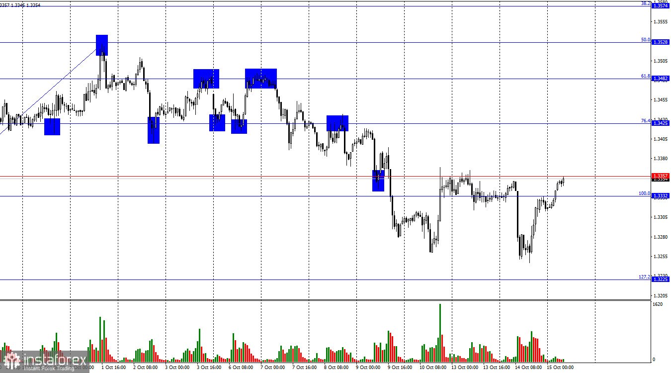 Sur le graphique horaire, la paire GBP/USD a rebondi mardi du niveau 1.3332–1.3357 et est descendue vers le niveau correctif de Fibonacci de 127.2% à 1.3225. Cependant, dans la deuxième moitié de la journée, la paire a inversé en faveur de la livre et est retournée au niveau 1.3332–1.3357. Un mouvement ferme au-dessus de cette zone soutiendrait une croissance continue vers le prochain niveau de 76.4% de Fibonacci à 1.3425.