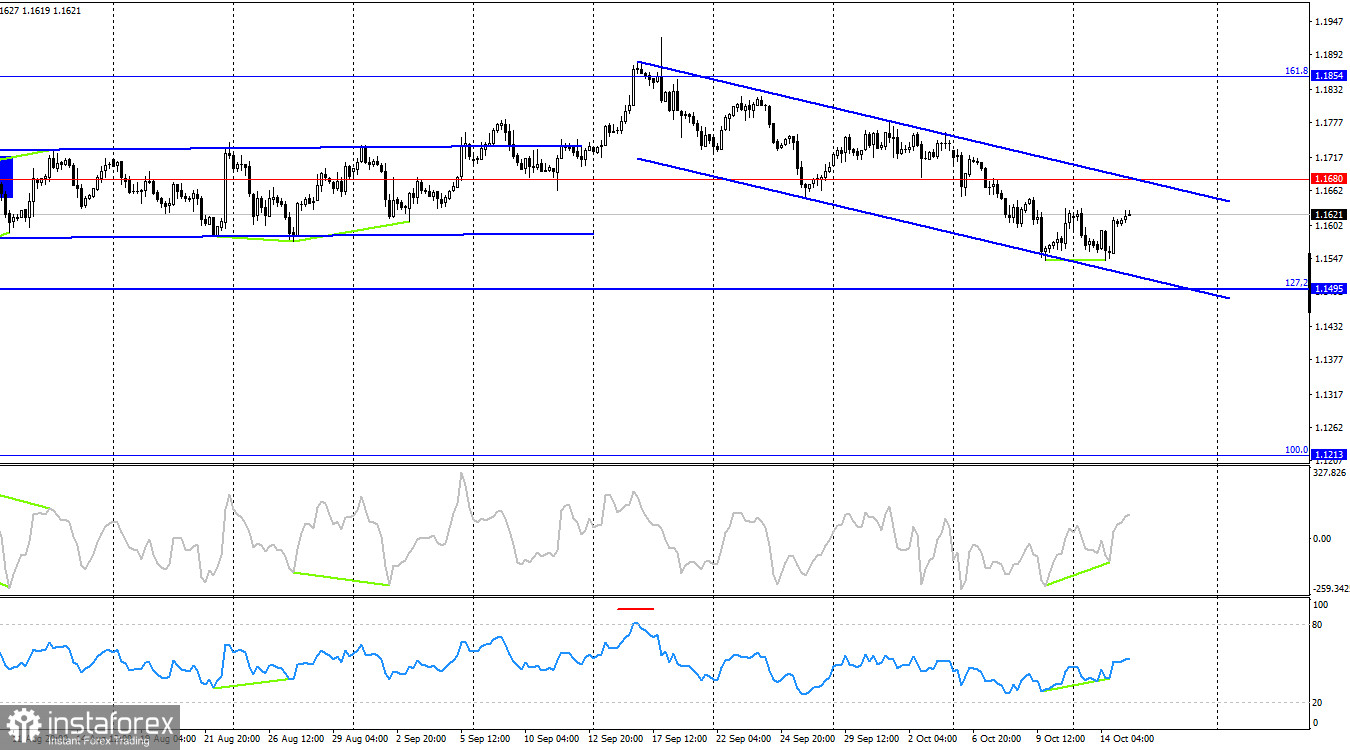 Sur le graphique en 4 heures, la paire s'est consolidée en-dessous de 1,1680, permettant aux traders de s'attendre à une poursuite du déclin vers le niveau de correction Fibonacci de 127,2 % à 1,1495. Cependant, une divergence haussière sur l'indicateur CCI pourrait aider à stopper la baisse actuelle. Une clôture au-dessus de 1,1680 et du canal de tendance descendant favoriserait l'euro et signalerait une reprise potentielle de la tendance "haussière" vers le niveau Fibonacci de 161,8 % à 1,1854.