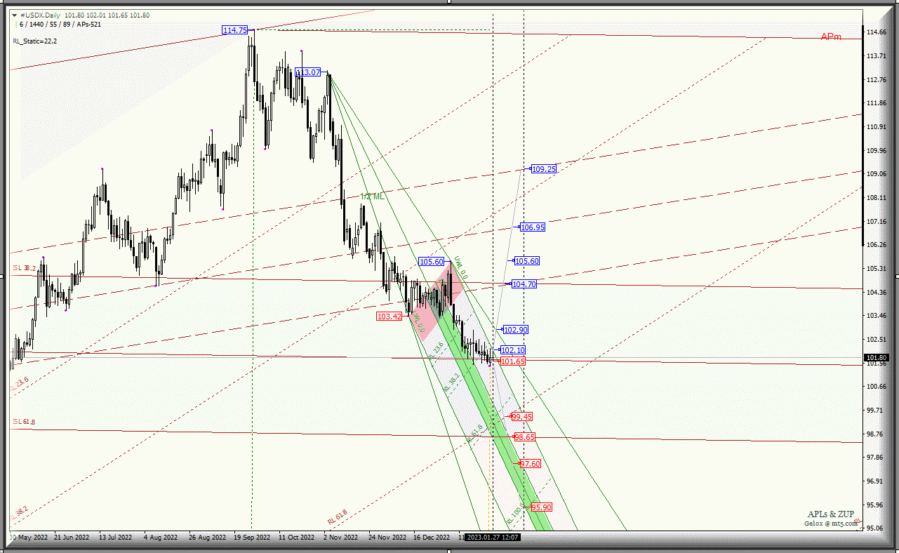Индекс доллара - #USDX-Daily - с 30 января 2023 г. продолжит свое движение в зоне равновесия (104.70 - 101.65 - 98.65) вил старшего операционного масштаба Minor-Daily в зависимости от направления пробоя диапазона: