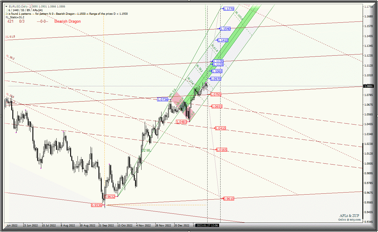 Единая европейская валюта - EUR/USD-Daily - с 30 января 2023 г. так же продолжит развитие своего движения в зоне равновесия (1.1540 -1.1170 - 1.0795) вил старшего операционного масштаба Minor-Daily в соответствии с отработкой и направлением пробоя диапазона: