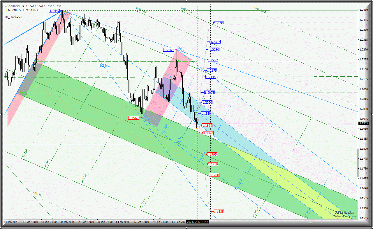 Валюта Его Величества - GBP/USD-h4 с 20 февраля 2023 г. так же будет развивать свое движения в соответствии с отработкой и направлением пробоя границ зоны равновесия (1.2030 - 1.1980 - 1.1925) вил младшего операционного масштаба Minuette-h1.