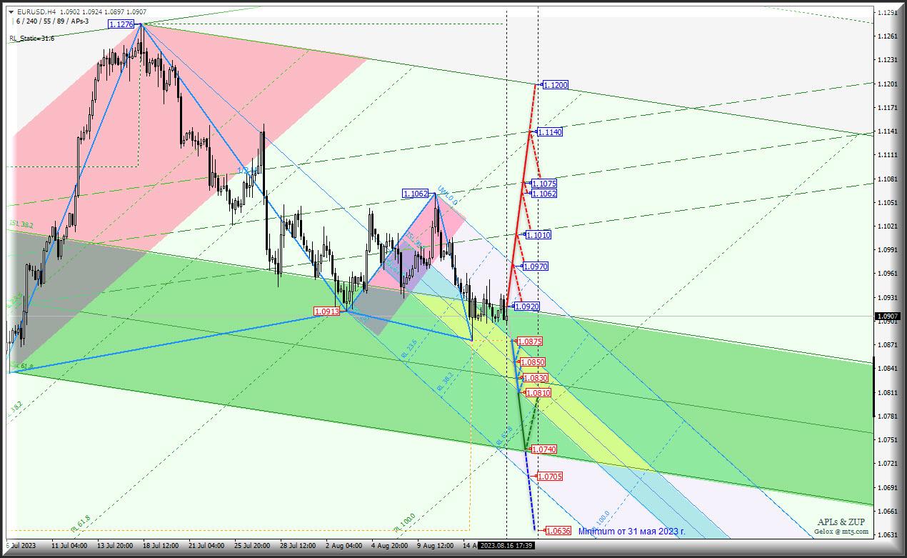 Единая европейская валюта - EUR/USD-h4 - с 17 августа 2023 г. так же будет развивать в зоне равновесия (1.0920 - 1.0830 - 1.0740) вил старшего операционного масштаба Minute-h4, но с учетом отработки и направления пробоя диапазона: