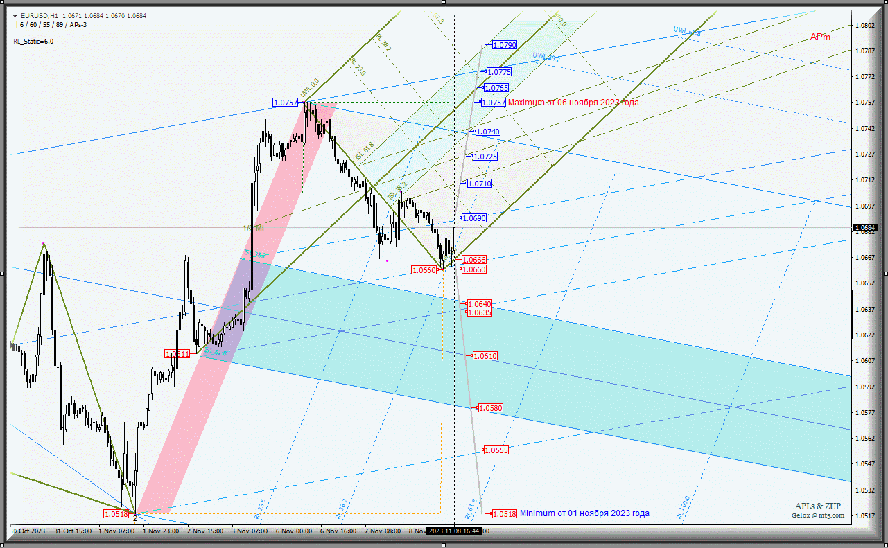 Движение единой европейской валюты - EUR/USD-h1 - 9 и 10 ноября 2023 г. будет обусловлено границами канала 1/2 Median Line (1.0960 - 1.0660 - 1.0635) вил старшего операционного масштаба Minuette-h1 и продолжится в соответствии с отработкой и направлением пробоя диапазона: