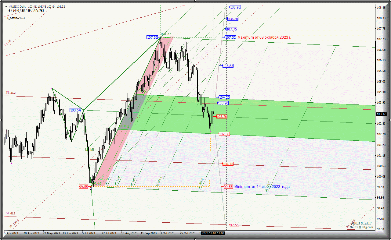 Индекс доллара - #USDX-Daily c 4 декабря 2023 г. продолжит развивать свое движение в соответствии с отработкой и направлением пробоя границ зоны равновесия (102.30 103.20 - 104.20) вил младшего операционного масштаба Minute-h4 и с учетом отработки верхней границы ISL38.2 (103.90) зоны равновесия вил старшего операционного масштаба Minor-Daily.
