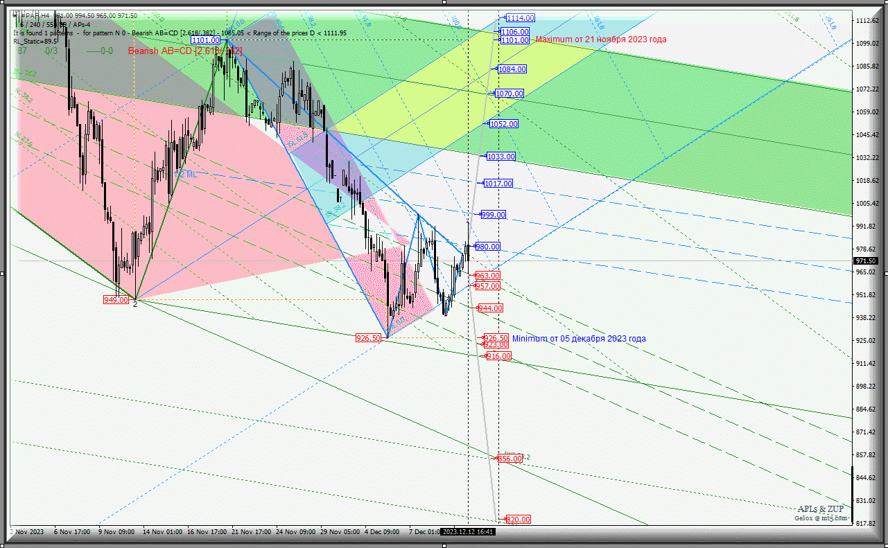 В случае совместного пробоя уровня сопротивления 963.00 на верхней границе канала 1/2ML Minute-h4 и начальной линии SSL (957.00) вил младшего операционного масштаба Minuette-h1 развитие движения данного актива продолжится в канале 1/2 Median Line (963.00 - 944.00 - 923.00) вил старшего операционного масштаба Minute-h4, а если случится обновление minimum 926.50 от 05 декабря 2023 года с последующим пробоем нижней границы канала 1/2ML Minute-h4 (923.00) и начальной линии SSL Minute-h4 (916.00) нисходящее движение Palladium - Current Month может иметь продолжение к уровню поддержки 856.00 на пересечении контрольной-LTL и предупредительной-LWL38.2 линий вил старшего операционного масштаба Minute-h4.