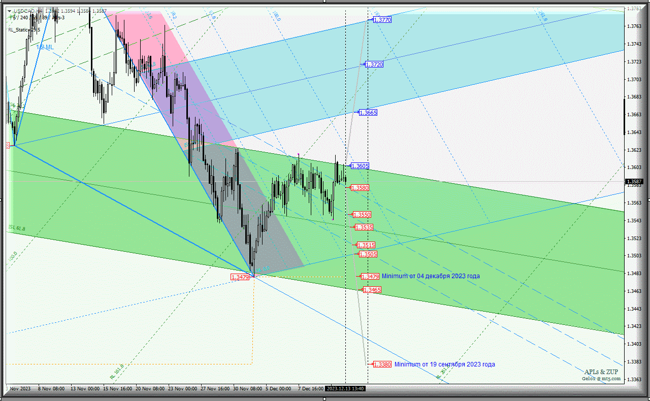 Канадский доллар - USD/CAD-h4 с 14 декабря 2023 г. , с определенной долей вероятности, продолжит развивать свое движение в зоне равновесия (1.3605 - 1.3535 - 1.3465) вил старшего операционного масштаба Minute-h4 с учетом отработки и направления пробоя диапазона: