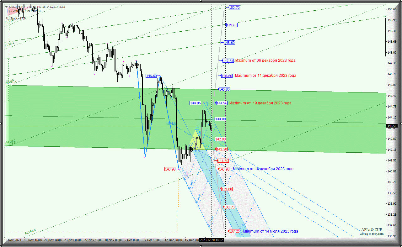 Если состоится пробой уровня сопротивления 144.00 на пересечении срединной линии Median Line Minute-h4 с начальной линии SSL младшего операционного масштаба Minuette-h1 - тогда станет актуальным обновление maximum 144.96 от 19 декабря 2023 года и достижение USD/JPY верхней границы ISL38.2 (145.80) зоны равновесия вил старшего операционного масштаба Minute-h4 с дальнейшей перспективой обновления maximum`s - 146.60 (от 11 декабря 2023 года) и 147.51 (от 06 декабря 2023 годя).