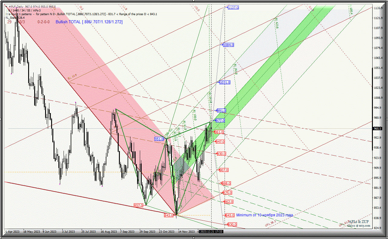 Развитие движения #PLF-Daily с 22 декабря 2023 года будет обусловлено границами канала 1/2 Median Line (930.0 - 961.0 - 991.0) вил старшего операционного масштаба Minor-Daily и продолжится в соответствии с отработкой и направлением пробоя границ зоны равновесия (947.0 - 961.0 - 977.0) вил младшего операционного масштаба Minute-h4.