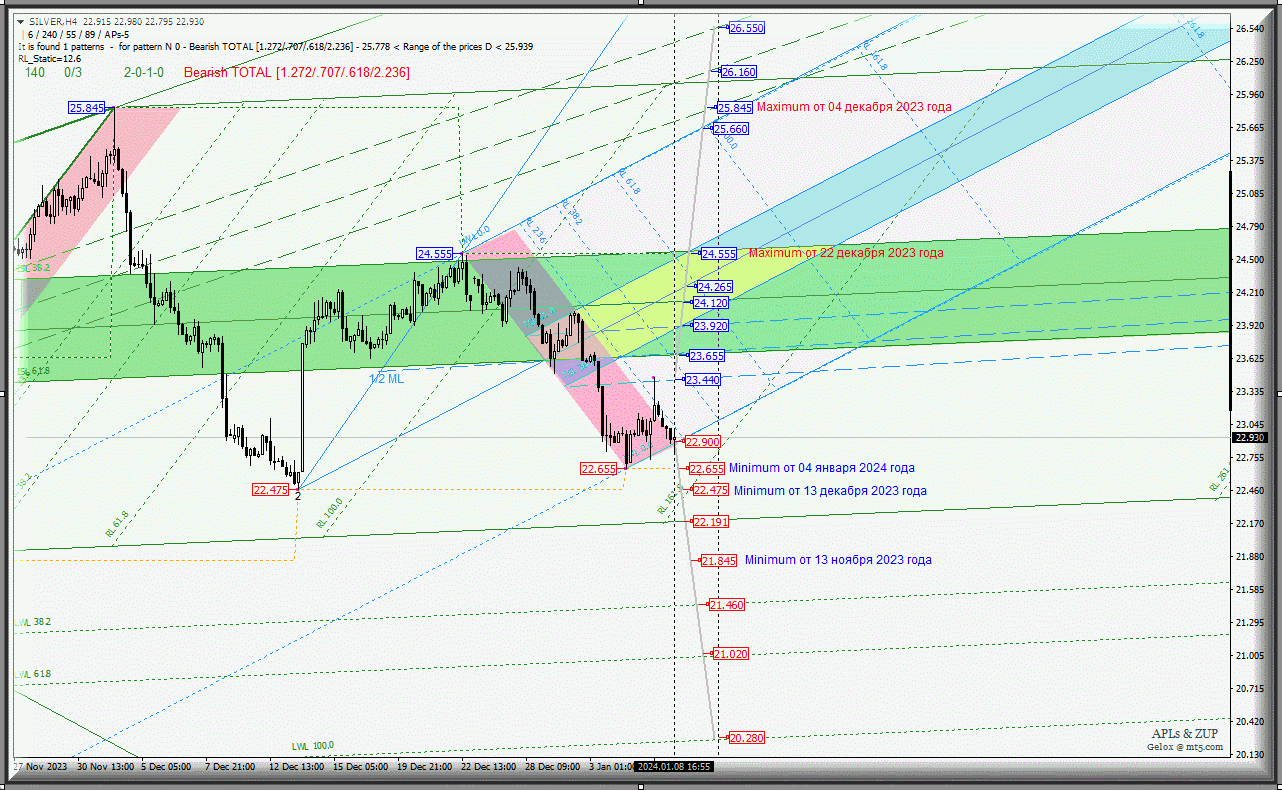 При пробое начальной линии SSL вил младшего операционного масштаба Minuette-h1 - уровень поддержки 22.900 - станет возможным обновление minimum`s 22.655 (от 04 января 2024 г.) и 22.475 (от 13 декабря 2023 г.), в случае которого Spot Silver продолжит нисходящее движение к конечной линии FSL (22.191) вил старшего операционного масштаба Minute-h4, к minimum 21.845 от 13 ноября 2023 г. и к предупредительной линии LWL38.2 Minute-h4 (21.460).