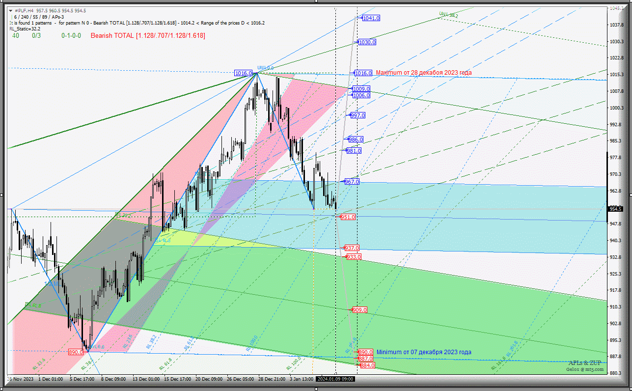Движения #PLF-h4 с 10 января 2024 года будет обусловлено отработкой и направлением пробоя границ зоны равновесия (937.0 - 951.0 - 967.0) вил младшего операционного масштаба Minuette-h1.