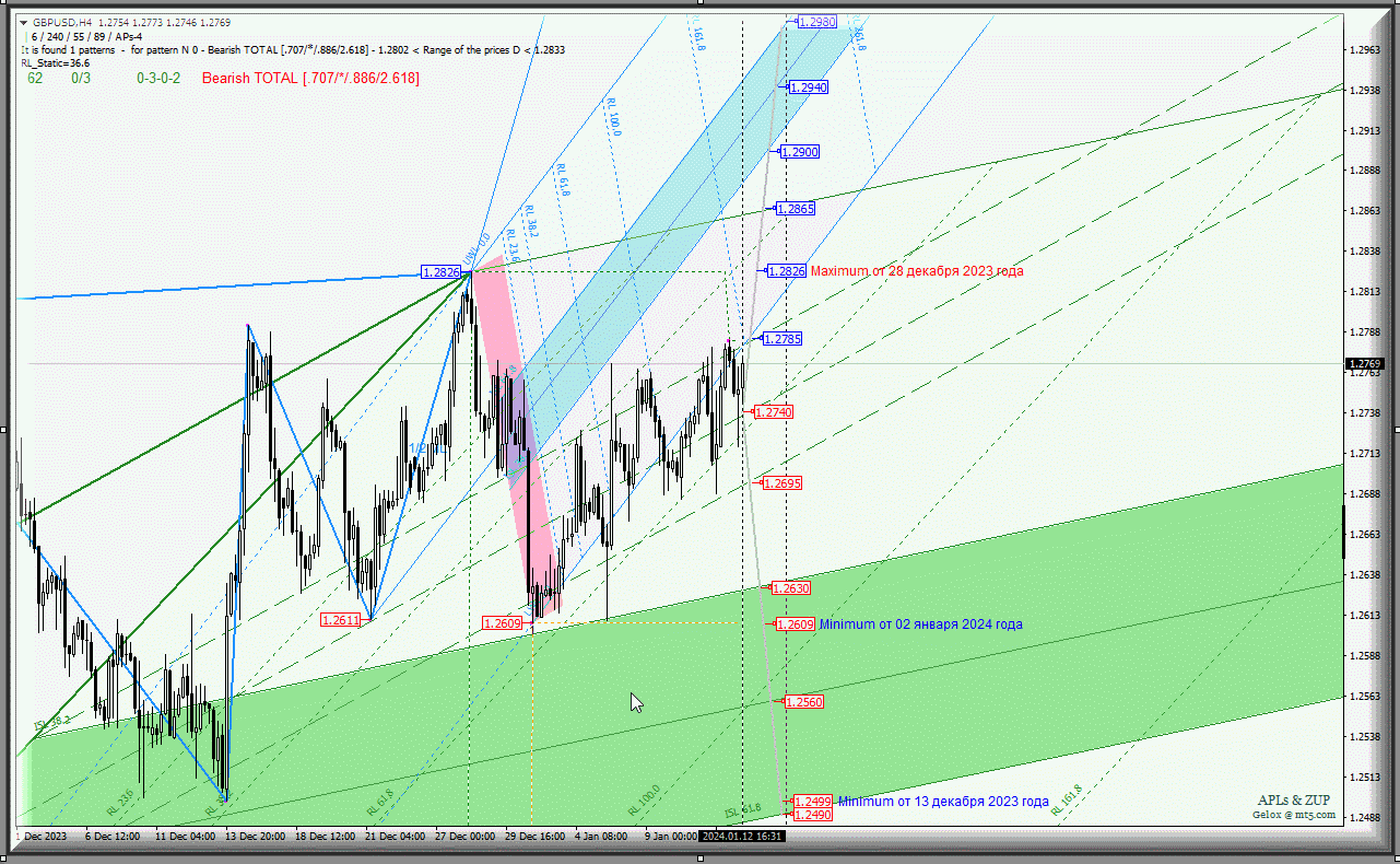 Движения валюты Его Величества - GBP/USD-h4 с 15 января 2024 года будет обусловлено границами канала 1/2 Median Line (1.2695 - 1.2740 - 1.2785) вил старшего операционного масштаба Minute-h4 и продолжится в соответствии с направлением пробоя указанных выше уровней.