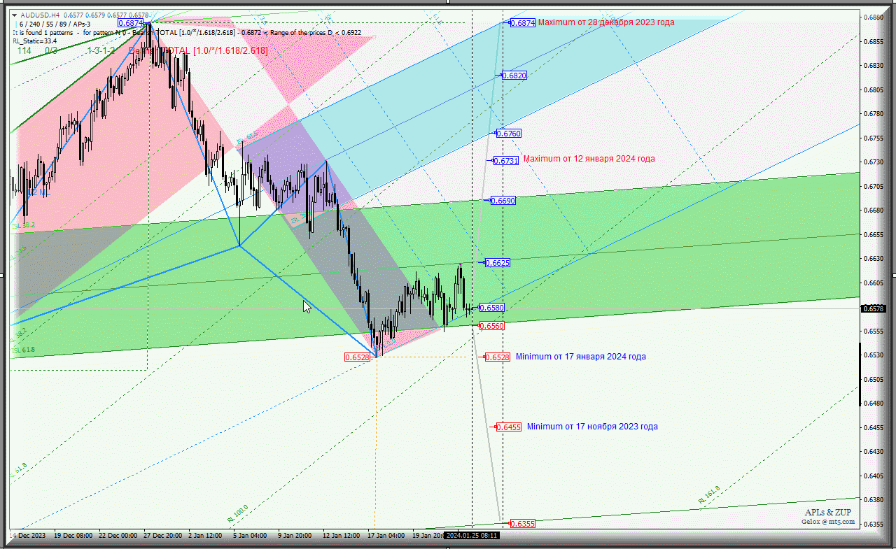 Если AUD/USD возвращается выше начальной линии SSL (уровень сопротивления 0.6580) вил младшего операционного масштаба Minuette-h1 - тогда станет актуальным развитие движения данной валютой пары к срединной линии Median Line Minute-h4 (0.6625) и к верхней границе ISL38.2 (0.6690) зоны равновесия вил старшего операционного масштаба Minute-h4 с перспективой достижения maximum 0.6731 от 12 января 2024 года и нижней границы ISL38.2 (0.6760) зоны равновесия вил младшего операционного масштаба Minuette-h1.