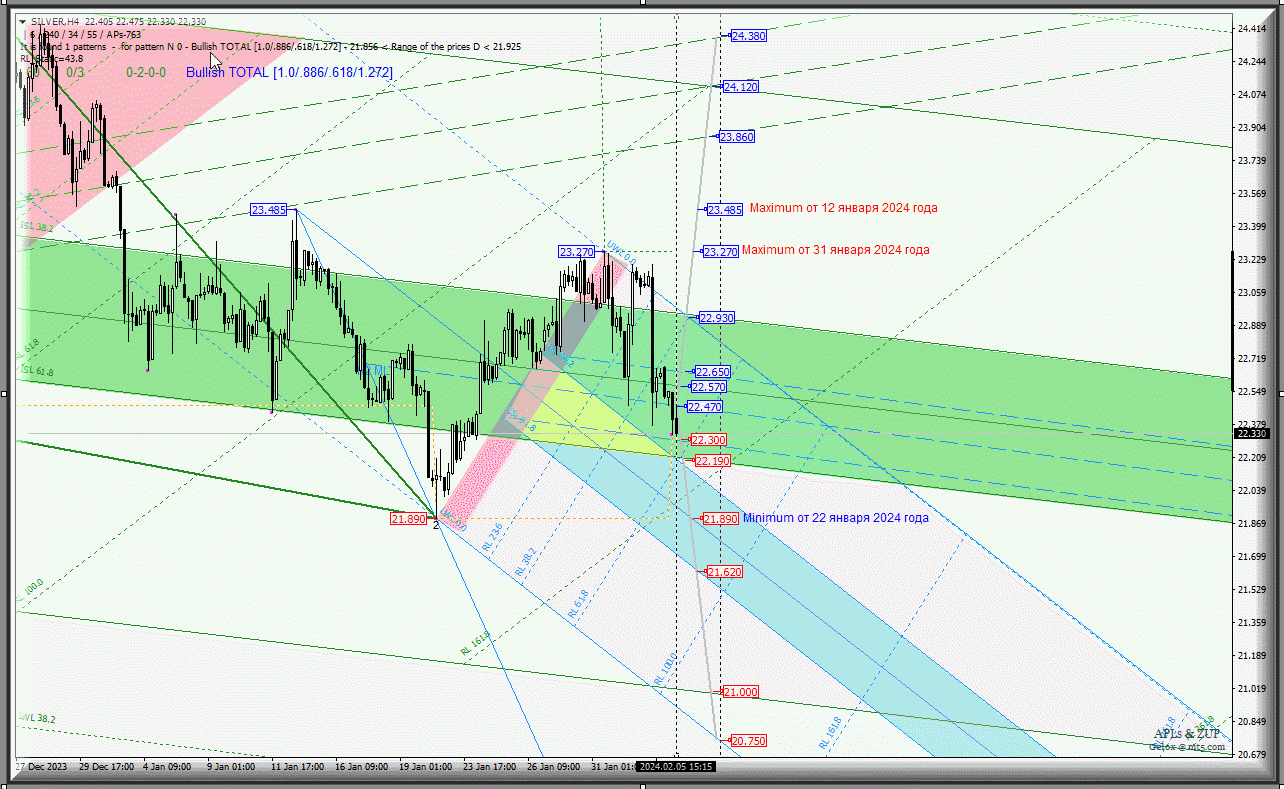 В случае же пробоя верхней границы канала 1/2 Median Line (уровень сопротивления 22.650) вил младшего операционного масштаба Minuette-h1 движение Spot Silver продолжится к верхней границе ISL38.2 (22.930) зоны равновесия вил старшего операционного масштаба Minute-h4, а пробой ISL38.2 Minute-h4 (22.930) сделает актуальным дальнейшее развитие движения этого инструмента к maximum`s 23.270 (от 31 января 2024 года) и 23.485 (от 12 января 2024 года).