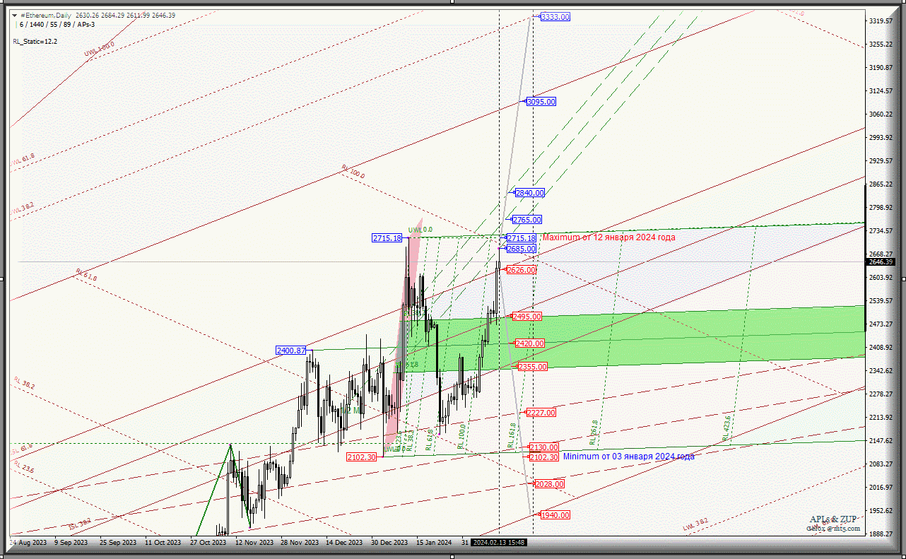 Развитие движения #Ethereum-Daily с 14 февраля 2024 года будет обусловлено отработкой и направлением пробоя достаточно узкого диапазона: