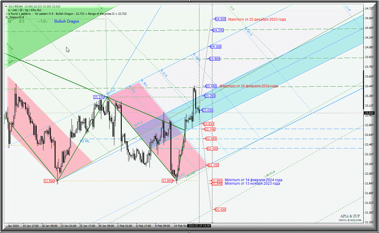 В случае пробоя верхней границы ISL61.8 (уровень сопротивления 23.290) зоны равновесия вил младшего операционного масштаба Minuette-h1, с последующим обновлением maximum 23.450 от 16 февраля 2024 года станет возможным развитие движения Spot Silver уже в границах канала 1/2 Median Line (23.450 - 23.900 - 24.370) вил старшего операционного масштаба Minute-h4 с учетом отработки конечной линии FSL Minuette-h1 (24.100).