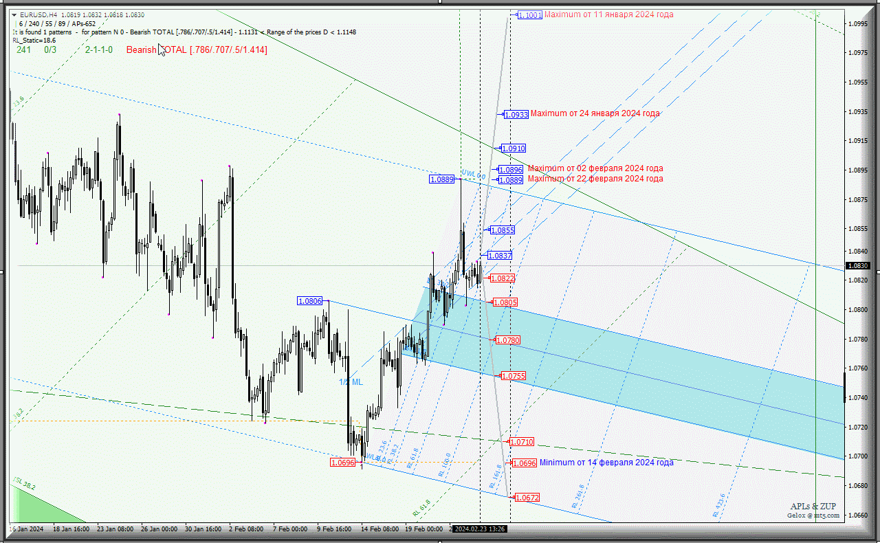 Единая европейская валюта - EUR/USD-h4 с 26 февраля 2024 года станет развивать движение в соответствии с отработкой и направлением пробоя границ канала 1/2 Median Line (1.0822 - 1.0837 - 1.0855) вил младшего операционного масштаба Minuette-h1.