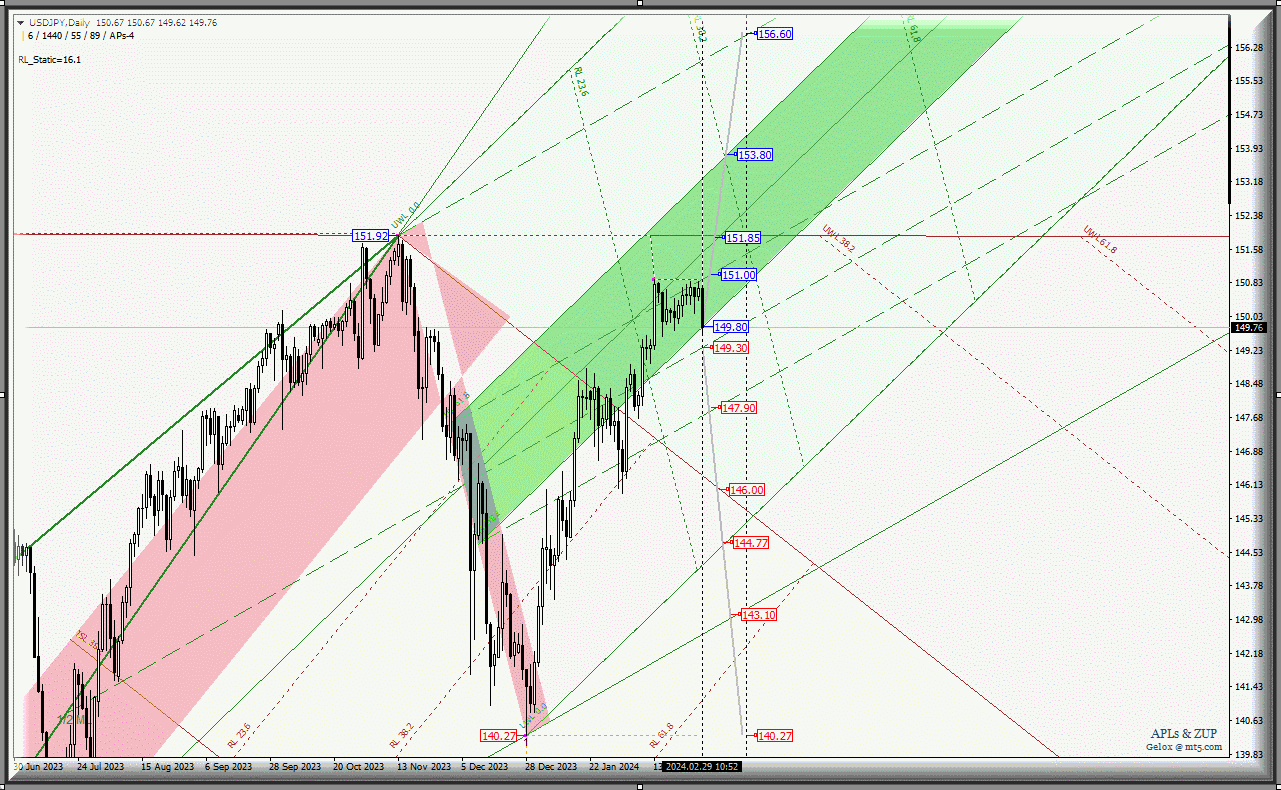 С 1 марта 2024 г. движение USD/JPY-Daily будет обусловлено границами зоны равновесия (153.80 - 151.85 - 149.80) и канала 1/2 Median Line (151.00 - 149.30 - 147.90) вил младшего операционного масштаба Minute-h4 в зависимости от отработки и направления пробоя диапазона: