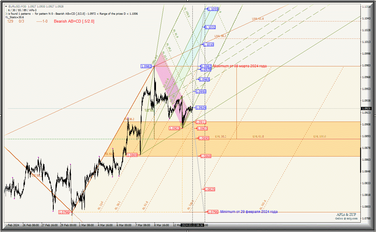 EUR/USD SubMinuette-m30 - обзор вариантов движения - c 13-15 марта 2024 года.
