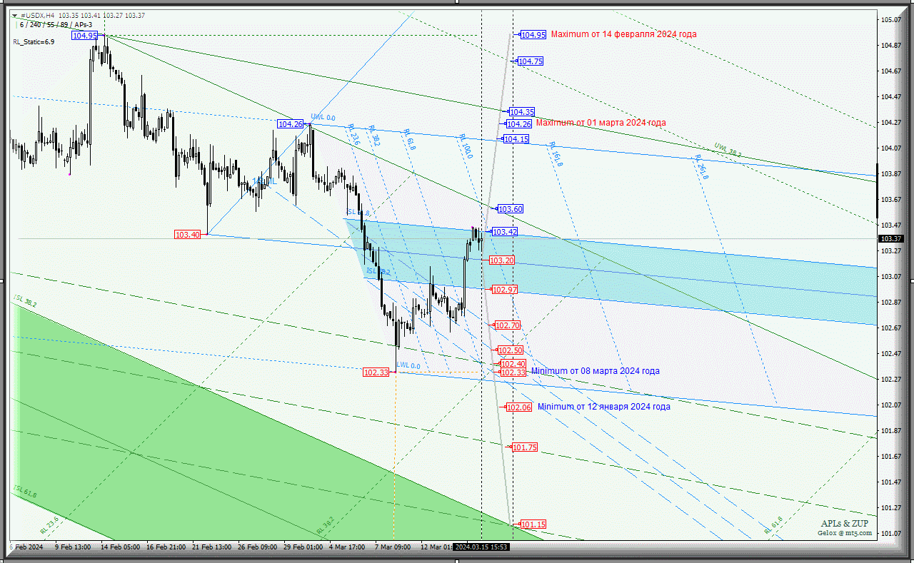 Нисходящее движения #USDX может иметь место быть при пробое нижней границы ISL38.2 (уровень поддержки 102.97) зоны равновесия вил младшего операционного масштаба Minuette-h1 и это движение продолжится к границам каналов 1/2 Median Line вил операционных масштабов - Minuette-h1 (102.70 - 102.50 - 102.33) и Minute-h4 (102.40 - 101.75 - 101.15), внутри которых находятся minimum`s - 102.33 (от 08 марта 2024 года) и 102.06 (от 12 января 2024 года).