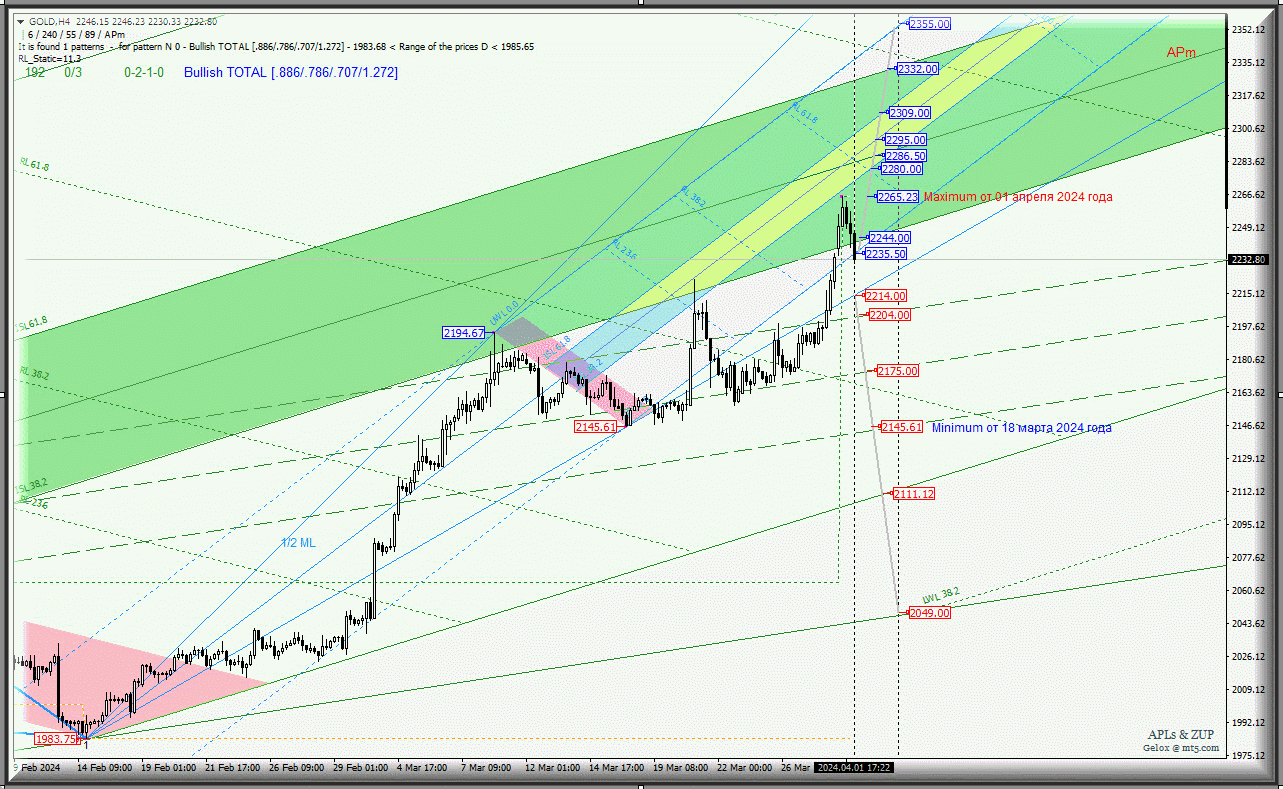 С 14 февраля 2024 года (minimum 1983.75) по 01 апреля 2024 года (maximum 2265.23) Spot Gold исполнил рост стоимости в +14,19%, а на момент подготовки этого обзора инструмент торговался на уровне 2232.80 (-1,43% от предыдущего максимума) , и думается , что с 02 апреля 2024 года развитие движения Spot Gold -h4 станет проистекать в соответствии с отработкой и направлением пробоя диапазона: