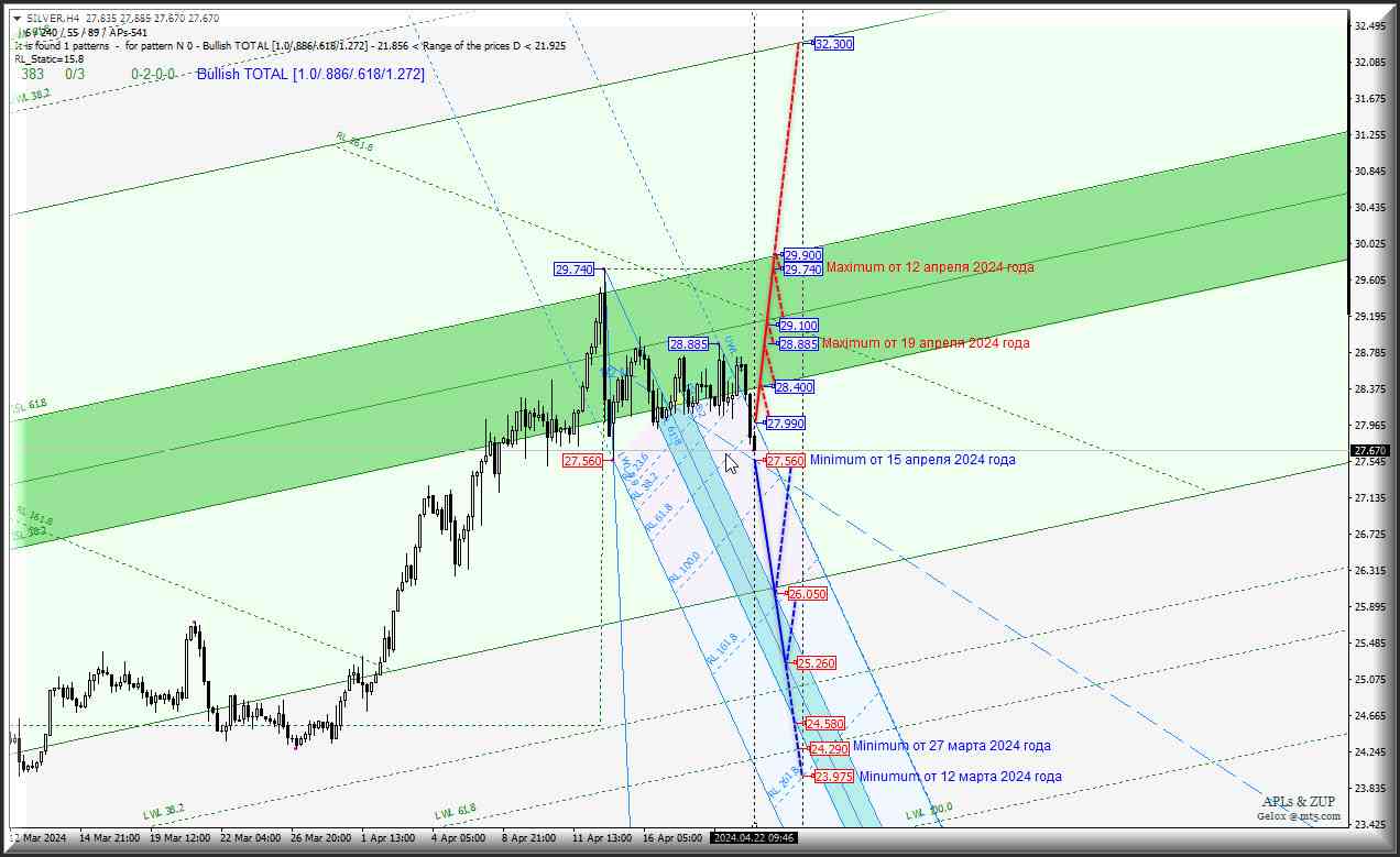 При пробое начальной линии SSL (уровень сопротивления 27.990) вил младшего операционного масштаба Minuette-h1 и ISL38.2 Minute-h4 (28.400) развитие движения Spot Silver может быть возвращено в зону равновесия (28.400 - 29.100 - 29.900) вил старшего операционного масштаба Minute-h4, внутри которой данное движение будет зависеть от отработки maximum`s - 28.885 (от 10 апреля 2024 года) и 29.740 (от 12 апреля 2024 года).