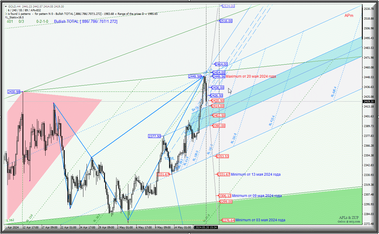 При пробое уровня сопротивления 2436.00 на верхней границе канала 1/2 Median Line вил младшего операционного масштаба Minuette-h1 - с последующим обновлением maximum 2449.56 от 20 мая 2024 года и последовательным совместным пробоем начальной линии SSL (2454.00) вил старшего операционного масштаба Minute-h4 с контрольной линией UTL Minuette-h1 (2464.00) - станет актуальным продолжение развития восходящего движения Spot Gold к контрольной линии UTL Minute-h4 (2516.00).