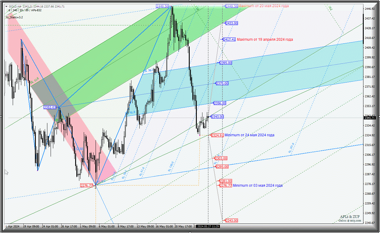 В случае обновления minimum от 24 мая 2024 года - пробой уровня поддержки 2324.91 на контрольной линии LTL вил старшего операционного масштаба Minute-h4 нисходящее движение Spot Gold может быть направлено к целям: