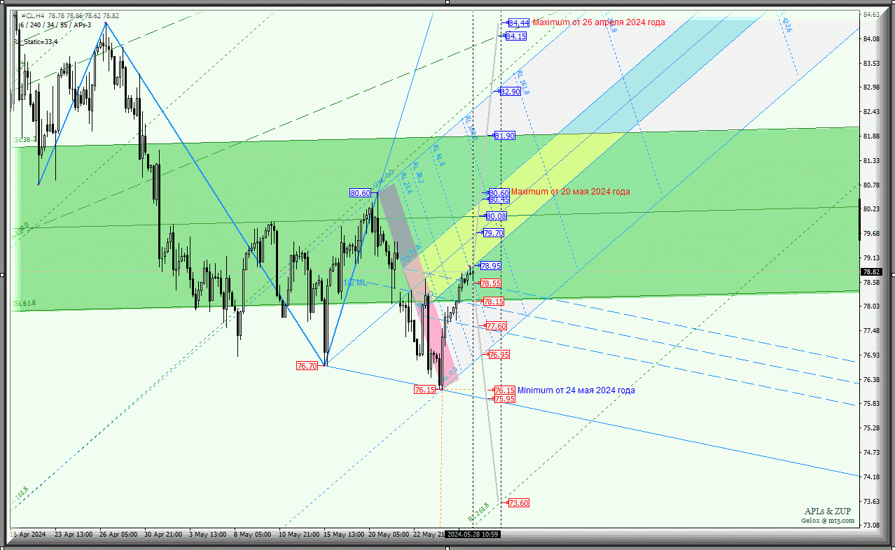 #CL с 28 мая 2024 года, с определенной долей вероятности, продолжит торговаться между minimum 76.15 от 24 мая 2024 года и maximum 80.60 от 20 мая 2024 года , и торговля эта станет определяться отработкой и направлением пробоя диапазона: