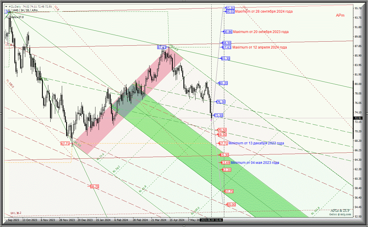 А далее, с 05 июня 2024 года, #CL продолжит развитие своего движения в канале 1/2 Median Line (76.30 - 73.50 - 70.50) вил младшего операционного масштаба Minute-h4, при этом ключевым уровнем будет являться 73.50 на 1/2 Median Line Minute-h4.