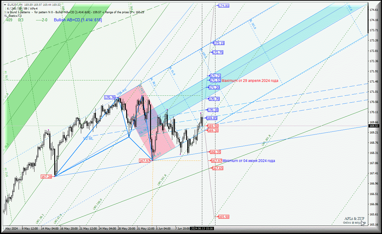 В этот раз, с 14 июня 2024 года, дальнейшее развитие движения этого кросс-инструмента будет определяться отработкой и направлением пробоя границ канала 1/2 Median Line (170.20 - 169.85 - 169.50) младшего операционного масштаба Minuette-h1/