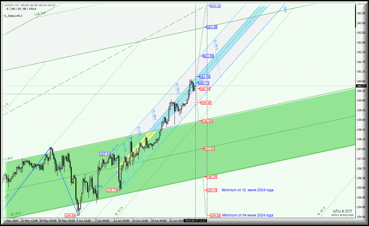 USD/JPY-h4 с 28 июня 2024 года продолжит свое движение исходя из отработки и направления пробоя границ зоны равновесия (160.44 - 160.71 - 161.00) восходящих вил младшего операционного масштаба Minuette-h1.