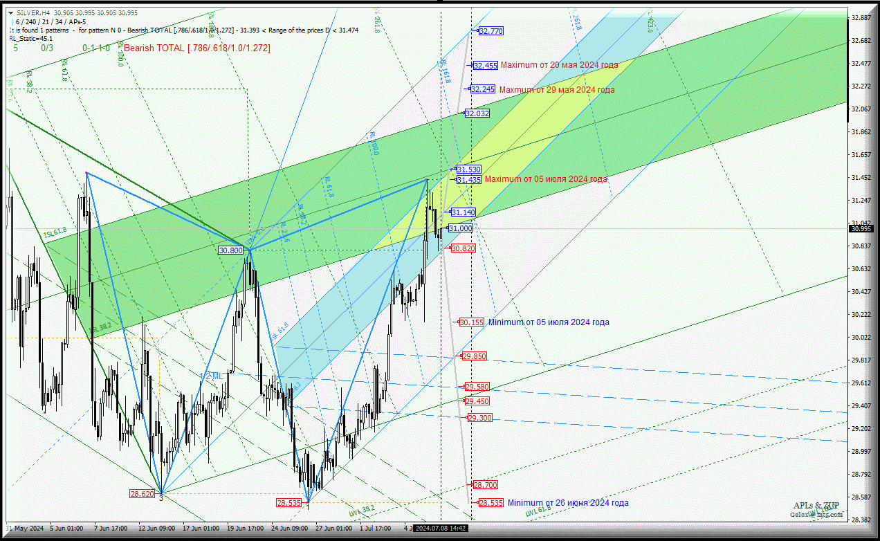 Развитие движения Spot Silver-h4 c 08 июля 2024 года продолжится в соответствии с отработкой и направлением пробоя границ (30.820 - 31.140 - 31.530) зоны равновесия вил младшего операционного масштаба Minuette-h1.