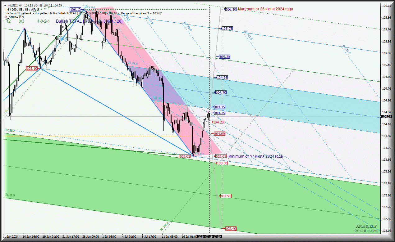 Развитие движения индекса доллара - #USDX-h4 с 22 июля 2024 года станет проистекать в зависимости от отработки и направления пробоя границ канала 1/2 Median Line (104.00 - 104.20 - 104.35) вил младшего операционного масштаба Minuette-h1.