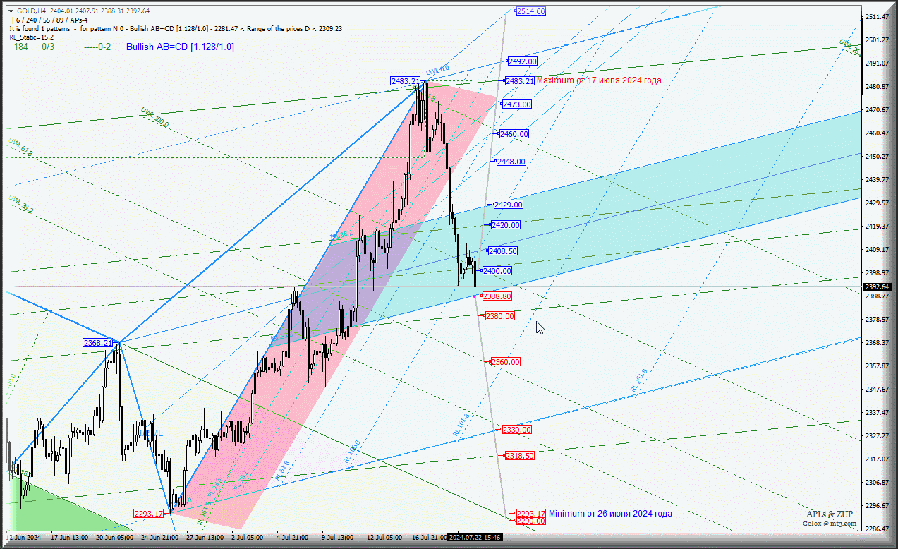 Дальнейшее развитие движения Spot Gold-h4 с 23 июля 2024 года будет обусловлено границами зоны равновесия (2429.00 - 2408.50 - 2388.80) вил младшего операционного масштаба Minuette-h2 и канала 1/2 Median Line (2420.00 - 2400.00 - 2380.00) вил старшего операционного масштаба Minute-4, а направление данного движения станет определяться в зависимости от отработки и направления пробоя диапазона: