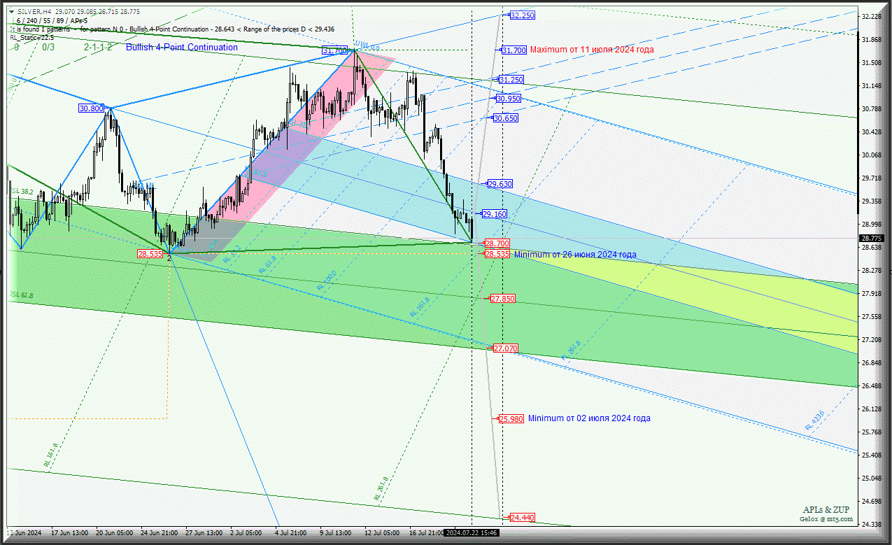 Движение Spot Silver-h4 c 23 июля 2024 года продолжит свое движение в соответствии с отработкой и направлением пробоя границ зоны равновесия (26.300 - 29.160 - 28.700) вил младшего операционного масштаба Minuette-h1.