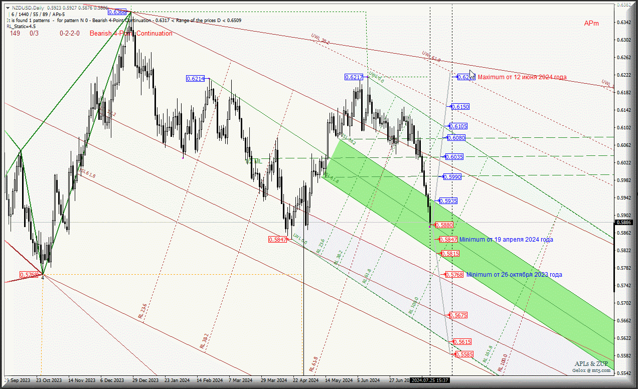Новозеландский доллар - NZD/USD-Daily с 26 июля 2023 г. продолжит свое движение исходя из отработки и направления пробоя границ зоны равновесия (0.5935 - 0.5880 - 0.5815) вил младшего операционного масштаба Minute-h4 и с учетом отработки minimum 0.5847 от 19 апреля 2024 года.