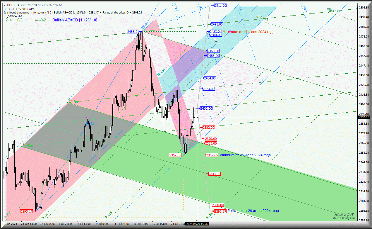 Движение Spot Gold-h4 с 30 июля 2024 года будет обусловлено отработкой и направлением пробоя границ канала 1/2 Median Line (2382.00 - 2302.00 - 2423.00) восходящих вил младшего операционного масштаба Minuette-h1.