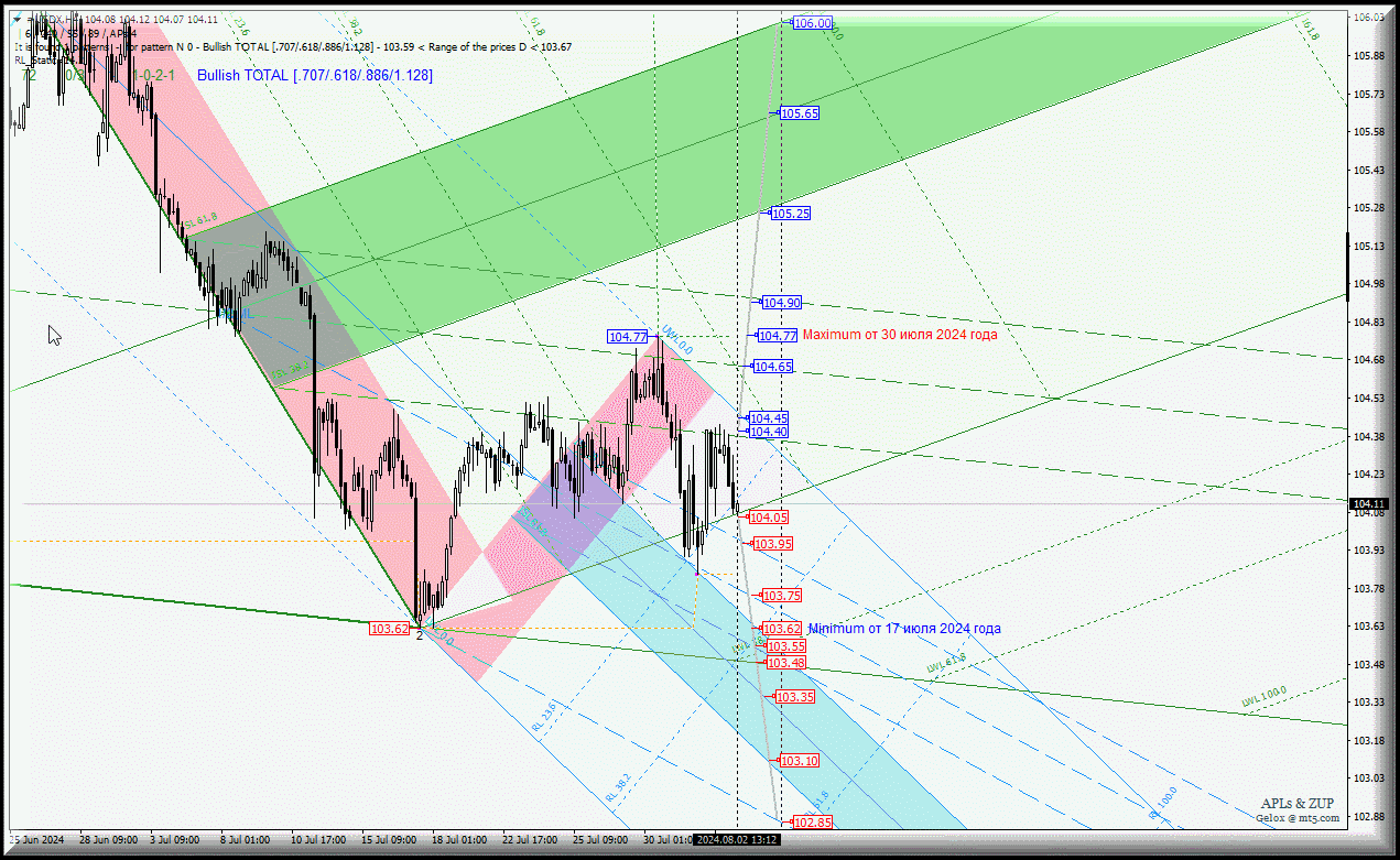 Восходящее движение индекса доллара станет возможным при совместном пробое уровня сопротивления 104.40 на нижней границе канала 1/2ML Minute-h4 и начальной и начальной линии SSL (104.45) вил младшего операционного масштаба MInuette-h1, и в этом случае данное движение продолжится в канале 1/2 Median Line Minute-h4 (104.40 - 104.65 - 104.90) с учетом отработки maximum 104.77 от 30 июля 2024 года и с возможным достижением нижней границы ISL38.2 (105.25) зоны равновесия вил старшего операционного масштаба Minute-h4.