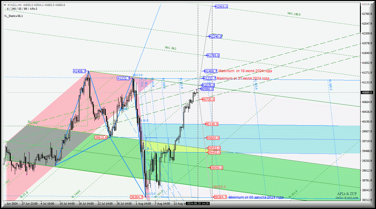 Основные технические уровни для торговли #INDU - h4 - обзор вариантов движения c 21 августа 2024 года.