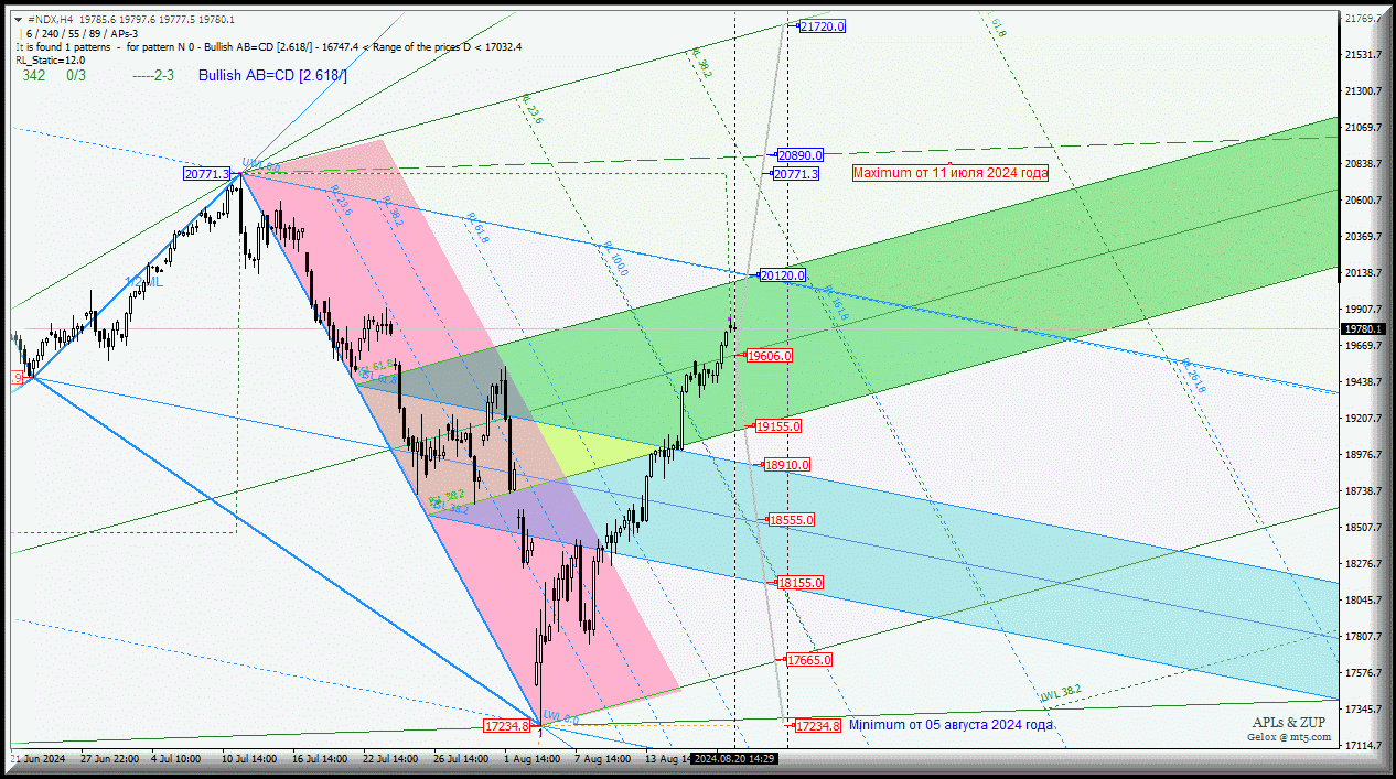 Движение NASDAQ-100 с 21 августа 2024 года будет зависеть от отработки и направления пробоя границ зоны равновесия (19155.0 - 19606.0 - 20120.0) вил старшего операционного масштаба Minute-h4/