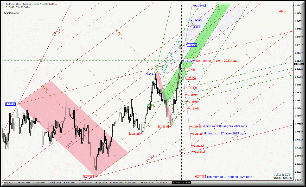 Движение валюты Его Величества - GBP/USD-Daily с 26 августа 2024 года будет зависеть от сильного уровня сопротивления 1.31409 (maximum от 14 июля 2023 года) на пересечении верхней границы ISL61.8 зоны равновесия вил младшего операционного масштаба Minute-h4 с нижней границей ISL38.2 зоны равновесия вил старшего операционного масштаба Minor-Daily и конечной Shiff Line Minor-Daily.