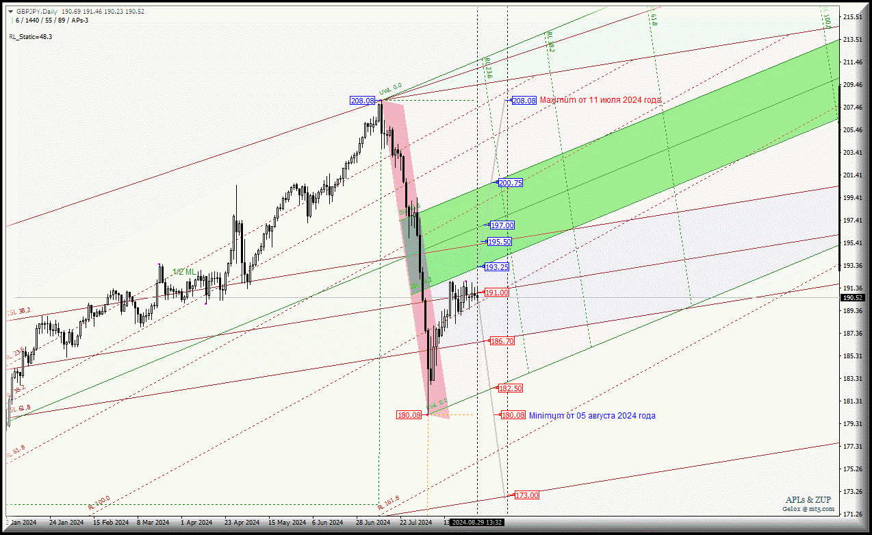 GBP/JPY оказывается ниже срединной линии Median Line Minor-Daily - уровень поддержки 191.00 - тогда нисходящее движение данного инструмента будет направлено к нижней границе ISL61.8 (186.70) зоны равновесия вил старшего операционного масштаба Minor-Daily с вариантом последующего достижения начальной линии SSL Minute-h4 (182.50) и minimum 180.08 от 05 августа 2024 года.