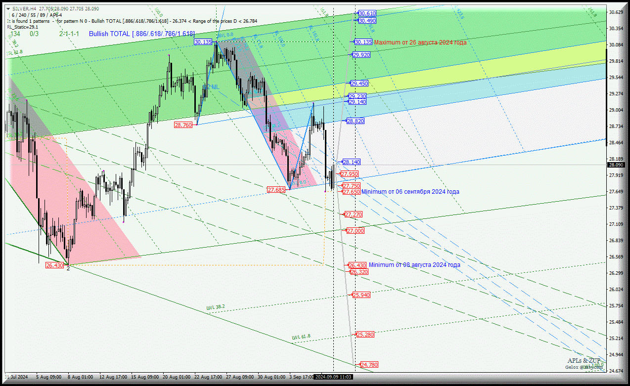 Движение Spot Silver-h4 c 10 сентября 2024 года будет обусловлено отработкой и направлением пробоя границ канала 1/2 Median Line (27.750 - 27.950 - 28.140) вил младшего операционного масштаба Minuette-h1.