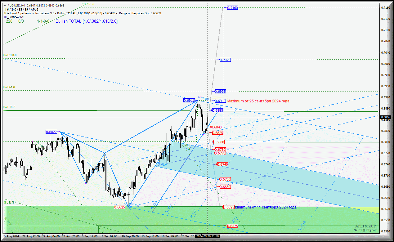 В случае последовательного пробоя предупредительной линии UWL38.2 вил старшего операционного масштаба Minute-h4 - уровень сопротивления 0.6885 - и maximum 0.6910 от 25 сентября 2024 года восходящее движение австралийского доллара может иметь продолжение к предупредительной линии UWL61.8 Minute-h4 (0.7020).
